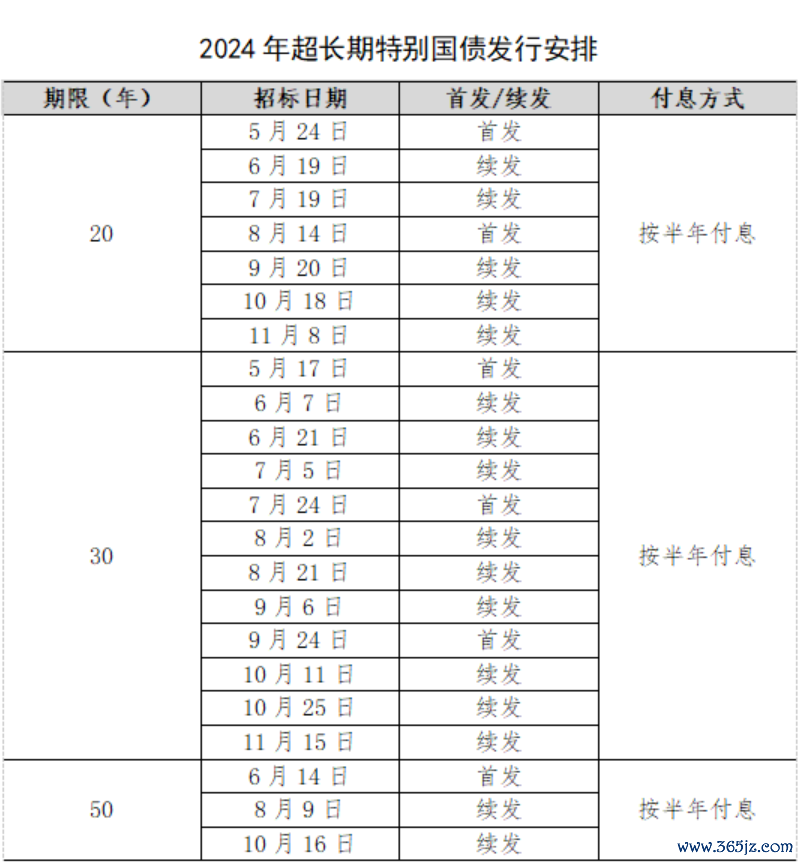 根据发行安排,今年将发行7只20年期超长期特别国债,其中首发2只、续发5只,最早于5月24日发行;将发行12只30年期超长期特别国债,其中首发3只、续发9只,最早于5月17日发行;拟发行3只50年期超长期特别国债,其中首发1只、续发2只,最早于6月14日发行。