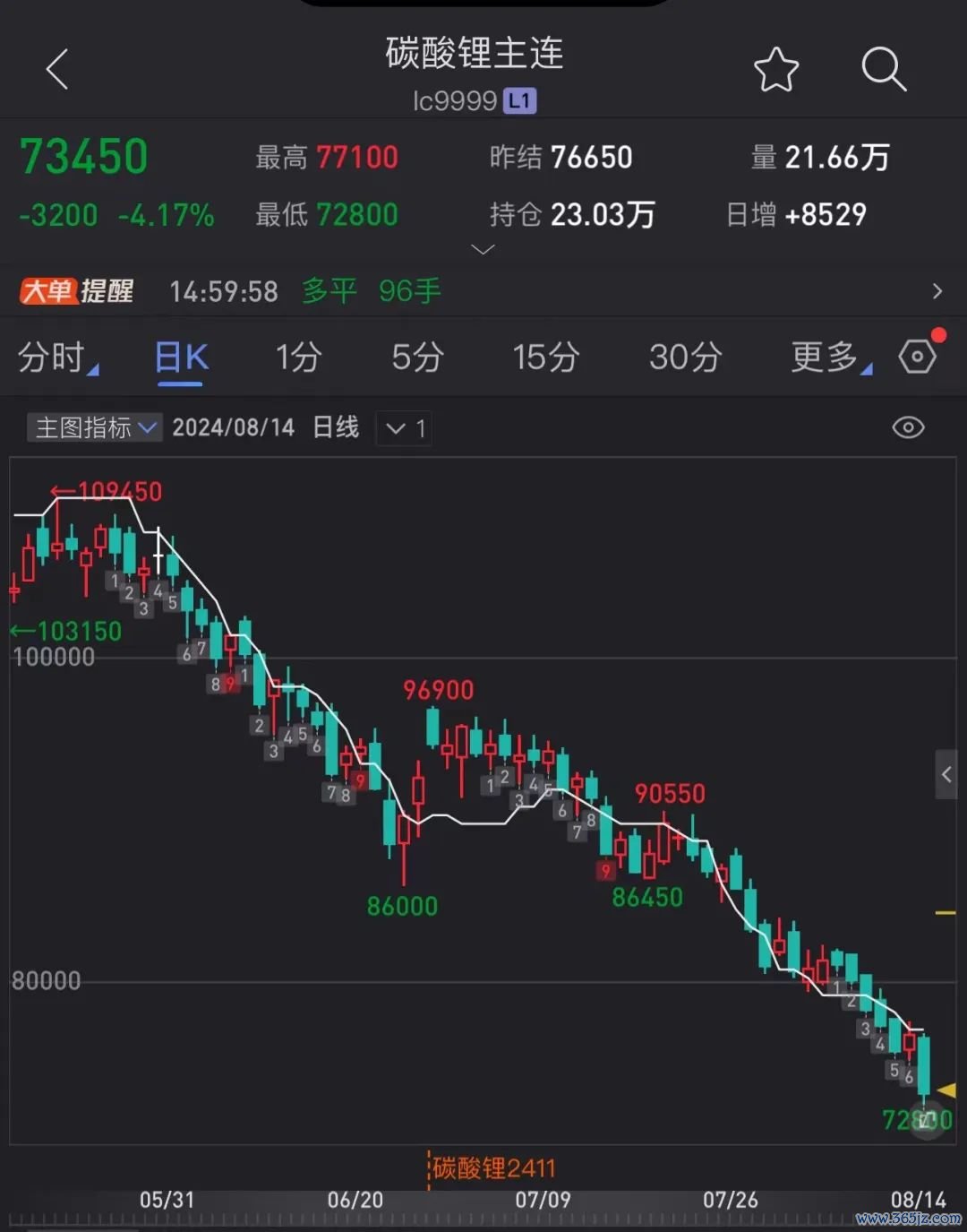 8月14日,国内锂价再度大跌。期货碳酸锂主力合约(lc2411)下跌3200元/吨,收跌至7.35万元/吨,跌幅达到4.17%。
