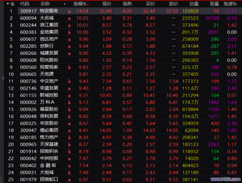 房地产板块多股涨停。特发服务大涨超14%,大名城,滨江集团,我爱我家等封板。值得一提的是,万科、保利、招商蛇口等股票皆出现明显异动。这基本意味着整个板块迎来了大利好。港股地产股也是持续走高,万科企业、旭辉控股集团涨超16%。