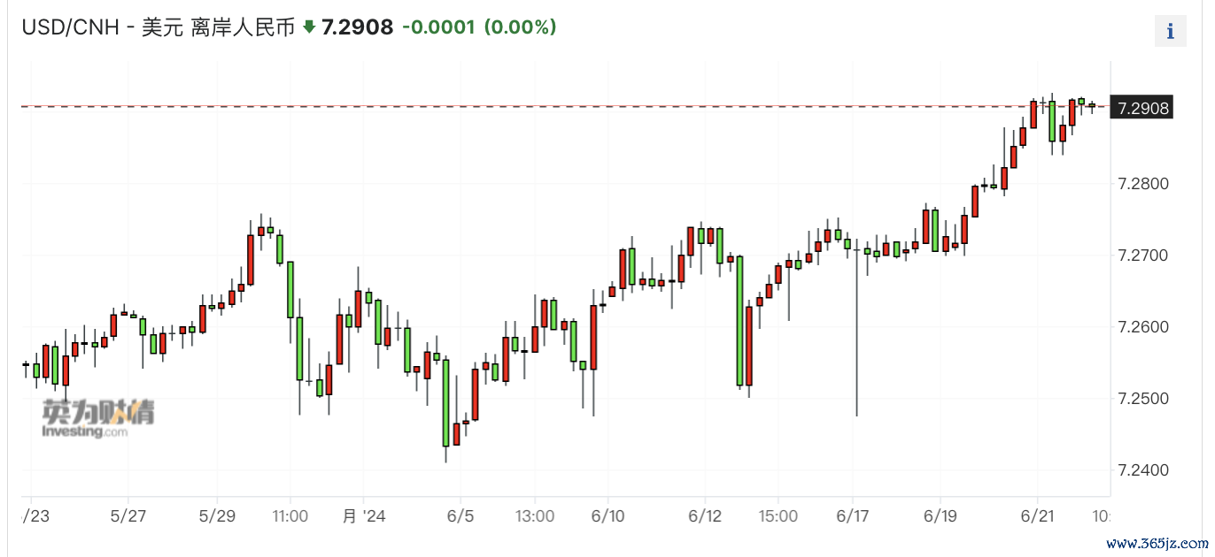 6月21日,人民币对美元中间价报7.1196,调贬4个点,创下近半年来新低。尽管如此,中间价相较于模型的偏离度仍接近1000点(调强),显示了央行的维稳意愿。截至当日收盘,美元/人民报 7.2613,接近2%的波动区间,美元/离岸人民币报7.2905,逼近7.3关口。