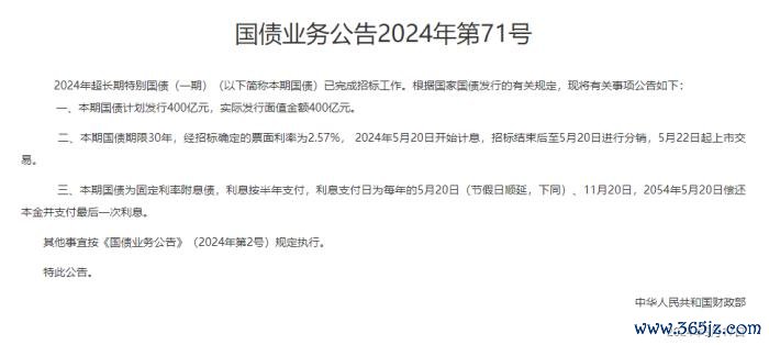 财政部官网17号发文称,本期国债实际发行面值金额400亿元,经招标确定的票面利率为2.57%,2024年5月20日开始计息,招标结束后至5月20日进行分销,5月22日起上市交易。